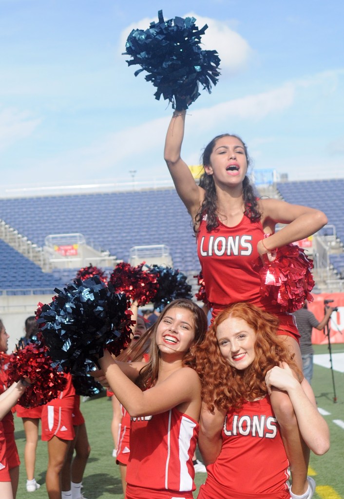 Lake Gibson’s Jason Lemmond tries to upend Palmetto Ridge’s Gavin Patton during their 160-pound match during Lake Gibson’s 39-32 victory on Saturday in the Class 2A final of the FHSAA Wrestling Dual State Meet at Osceola High School in Kissimmee. Lemmond won the match 11-5, clinching the Braves’ third state dual-match title.St. Thomas Aquinas hitter Allison Marble swings against Tampa Plant’s Kiara Miles (9) and Carson Gibbs (7) in St. Thomas Aquinas’ 25-17, 25-21, 25-21 victory over Tampa Plant in the Class 8A state volleyball championship match at West Port High School in Ocala. St. Thomas Aquinas won its third consecutive state title and fifth overall in school history. (Lynn Ramsey | FC)Chaminade-Madonna cheerleader Olivia Callari holds Gabriella Polio while Lorrany Oliveira also cheerls on the Lions late in the game against West Palm Beach King’s Academy.Chaminade-Madonna receiver Xavier Williams (6) tries to escape the pursuit of Trinity Christian’s Tyreke Johnson (13) and Nyem Bozeman (back) in Chaminade-Madonna College Prep’s 24-13 loss to Jacksonville Trinity Christian on Saturday, Dec. 10, 2016, in the Class 3A state-championship football game.